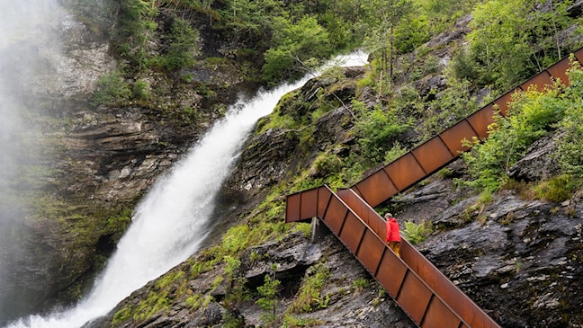 The waterfall is a magnificent sight when the river runs high. Here, rust-coloured stairs have been laid alongside the untamed rapids leading to the main cascade, continuing below the road leading to the fjord. From the road you can see only part of the river, but just a few hundred metres further up you can see the towering waterfall at close range. Paths take you through lush and enchanting vegetation to a sawmill dating from the 16th century and the old foundations of a house.