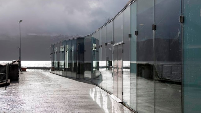 In 2004, when ferries were still in operation at Ropeid, the Norwegian Public Roads Administration completed a waiting room with toilets on the quay. The building has large glass surfaces that create a proximity to the fiord and the landscape, and a bare rough rock surface forms the inner wall. The beautiful waiting room is now in use as an open library and a venue for other cultural events.