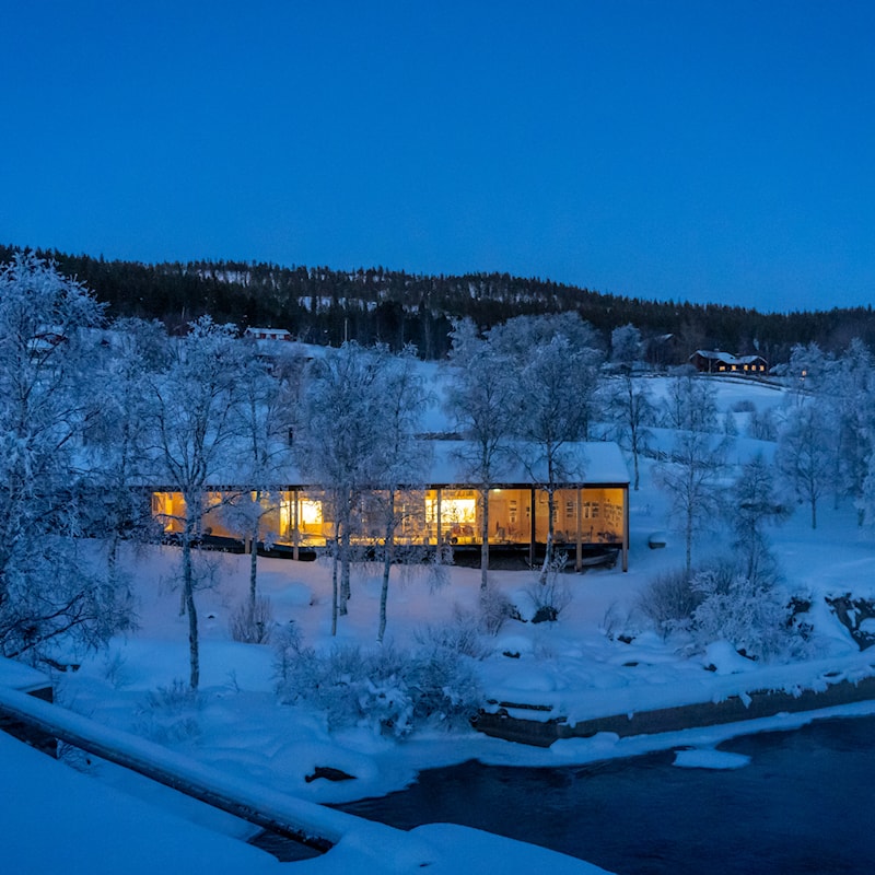 Fossehuset, the museum at Atnbrufossen waterfall, lies in a verdant birch grove. The building was formerly a sawmill with timber-floating facilities and a hydropower station, but is now also a venue for art exhibitions and concerts.