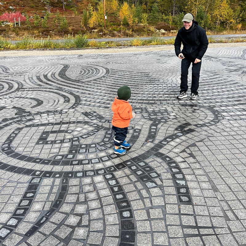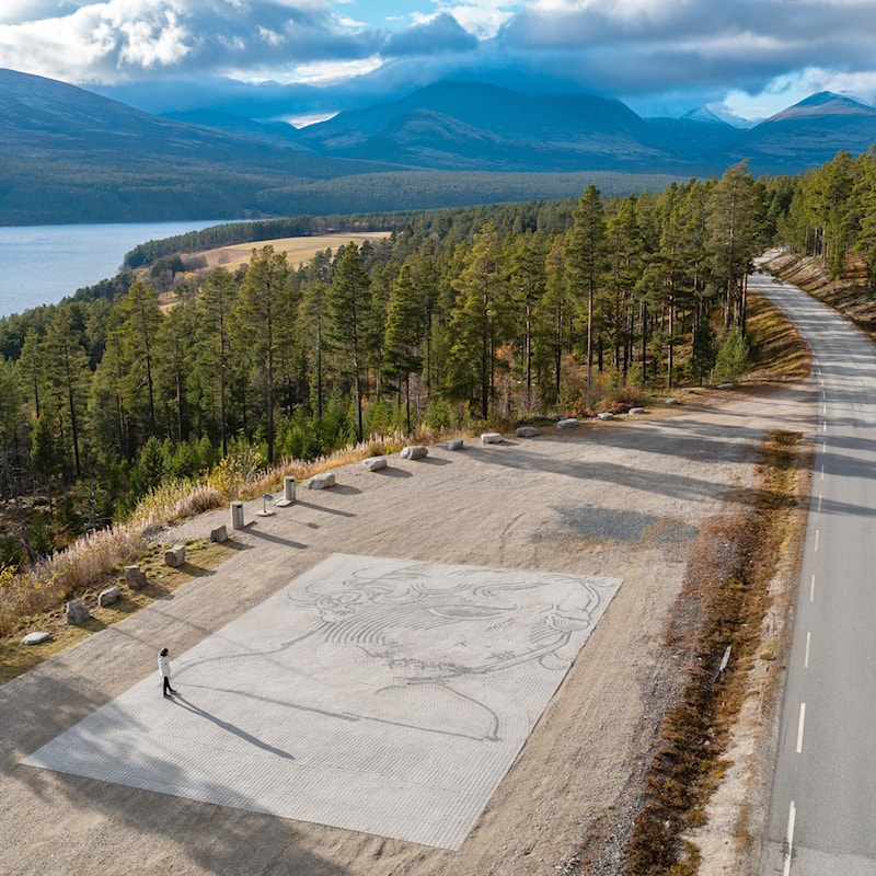 In this project, Faldbakken has taken an artistic approach that does not disturb nature. The mosaic is laid out as a horizontal picture where visitors find themselves both in and on the artwork, while the site also serves as a platform with a view to the mighty mountains of Rondane.
