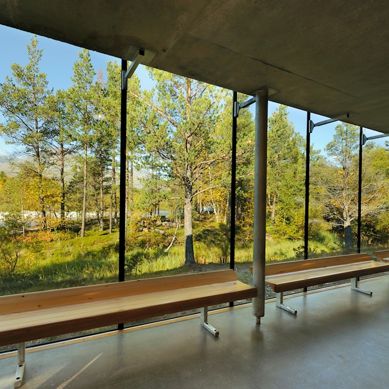 Strømbu is one of the main gateways to the Rondane massif and an excellent starting point for hikes in what was Norway’s first national park. The rest area has a roof terrace and a lounge directly adjacent to the river Atna that winds between pine trees and sand banks. The roof terrace provides a place to rest and admire the view of the mountains and the river.