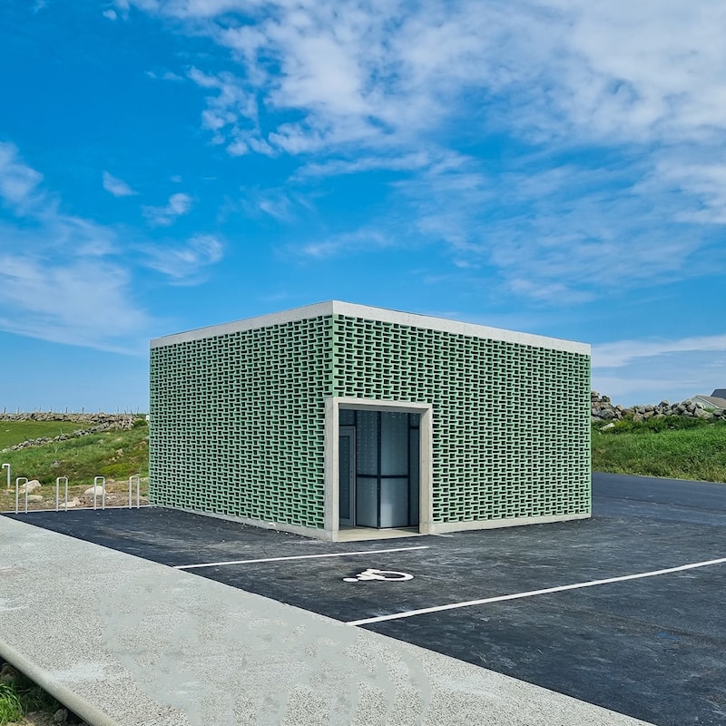Servicebygget ved parkeringa har to toalett og er kledd med spesialdesigna fasadestein som gjer at bygget lyser som ei lanterne når det er mørkt.